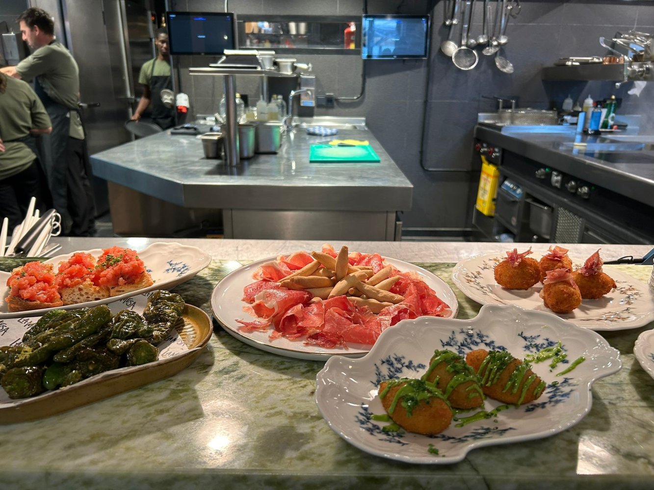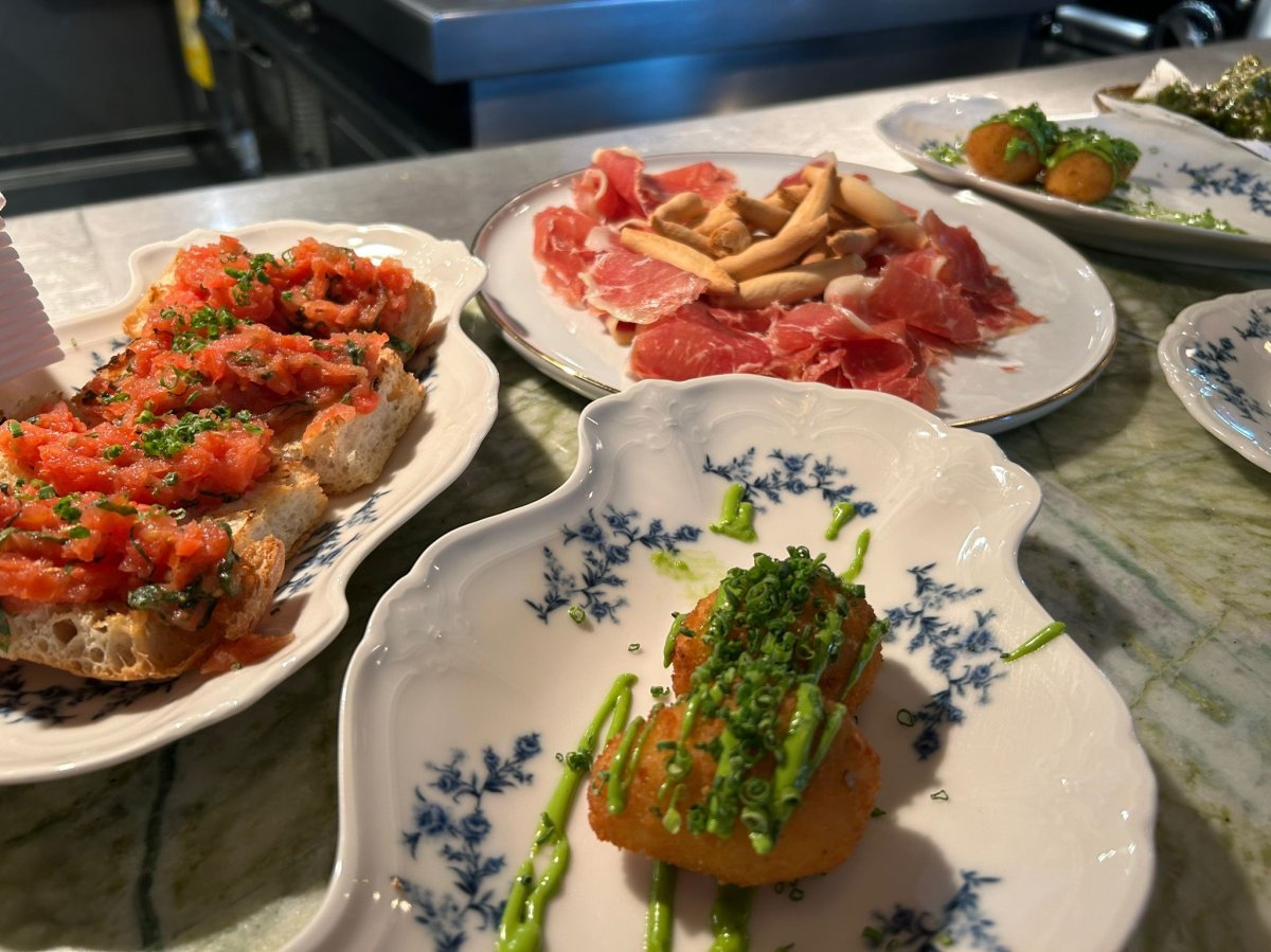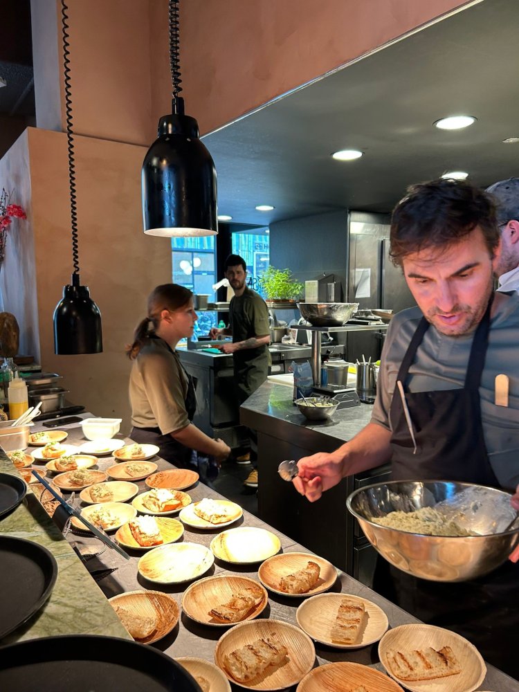 De locatie van de middag was meteen een primeur. Op het Gershwinplein — op de voormalige plek van Bolenius — opende La Mesa Zuidas onlangs haar deuren. Het restaurant, het jongere zusje van Limon, draait om modern Spanish cuisine: tapas, pinchos, vleesgerechten en Spaanse broodjes met een Baskische twist. De aanwezigen kregen een exclusieve proeverij: chixtorras met salade en pickled onions, en bacalhau in pincho-stijl met pipara's.