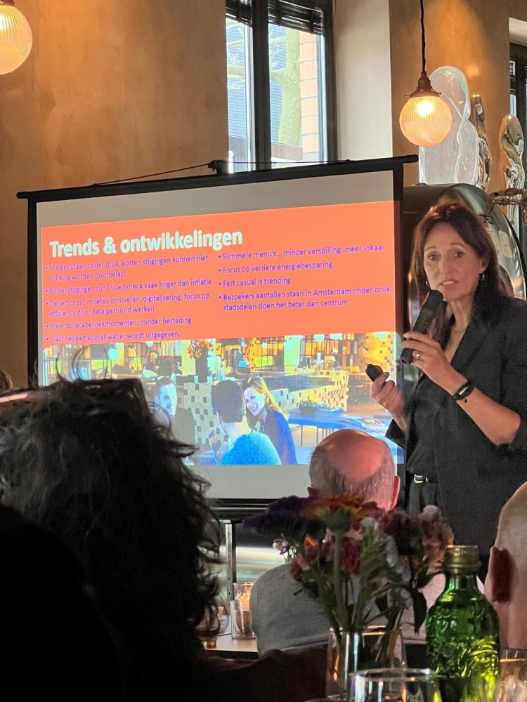 Eveline Doornegge van Koninklijke Horeca Nederland (KHN) Amsterdam opende de inhoudelijke sessie. KHN vertegenwoordigt de grotere horeca in de stad: ketens met tien of meer vestigingen en hotels. De organisatie presenteerde een nieuwe huisstijl en logo, maar de missie blijft onveranderd: opkomen voor een gezond ondernemersklimaat en een levendige bezoekerseconomie.